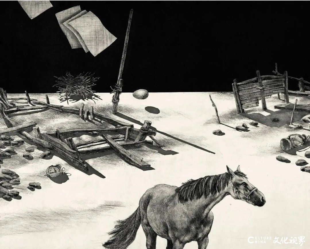 青岛画院版画家们的探索并未局限于物质媒介,而是将版画的语言、技术和意象等方面拓展至虚拟空间。杨越的铜版画主要以蚀刻为基础,辅以干刻,并越来越多地学习借鉴戈雅大量使用飞尘的手法,并辅以一系列特殊技法来展现画面上微妙的细节效果,营造出极具表现力的画面,在自觉和不自觉中,追求版画技术与艺术之间的平衡。新世纪以来,杨越在版画创作中,强化了技术与艺术的关系,趋向共生共融的创作生态,且在突破媒介边界时展现出更加松弛的思维张力与实验精神,既保持着对视觉语言的精准调控,又延续着内在精神能量的深度掘进。