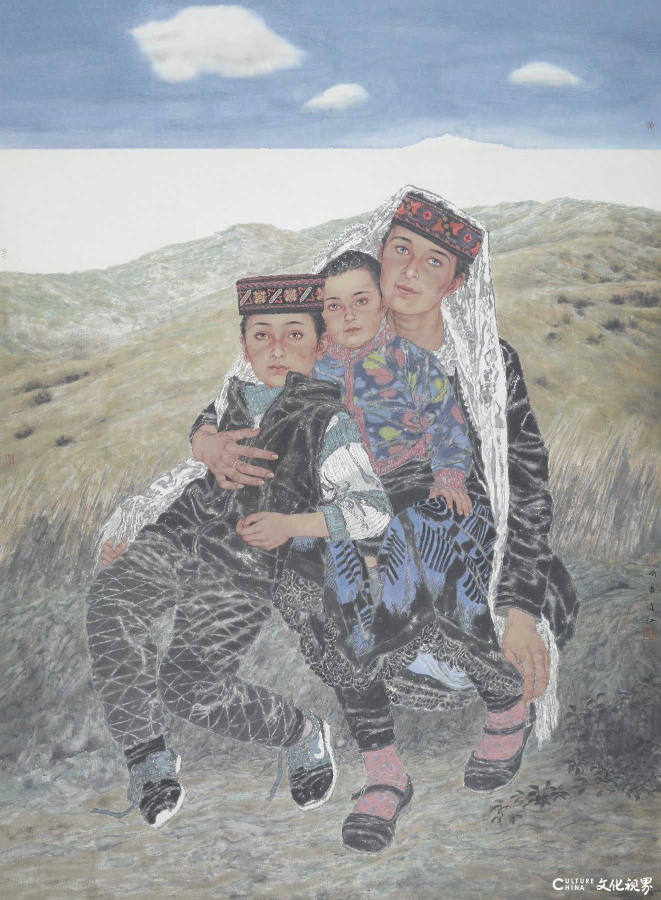 于文江对人物形象的塑造,始终遵循着“形神兼备”的古典美学原则,却又在当代语境中赋予其新的内涵。在《哈萨克迁徙——春的牧场》中,牧民们被风吹动的发丝与褶皱的皮肤,既包含了对人体结构的精准把握,又通过枯笔飞白的处理,使笔墨本身成为生命力的外化。这种将解剖学知识转化为笔墨语言的能力,得益于他对西方造型体系的深度研究与本土化改造。