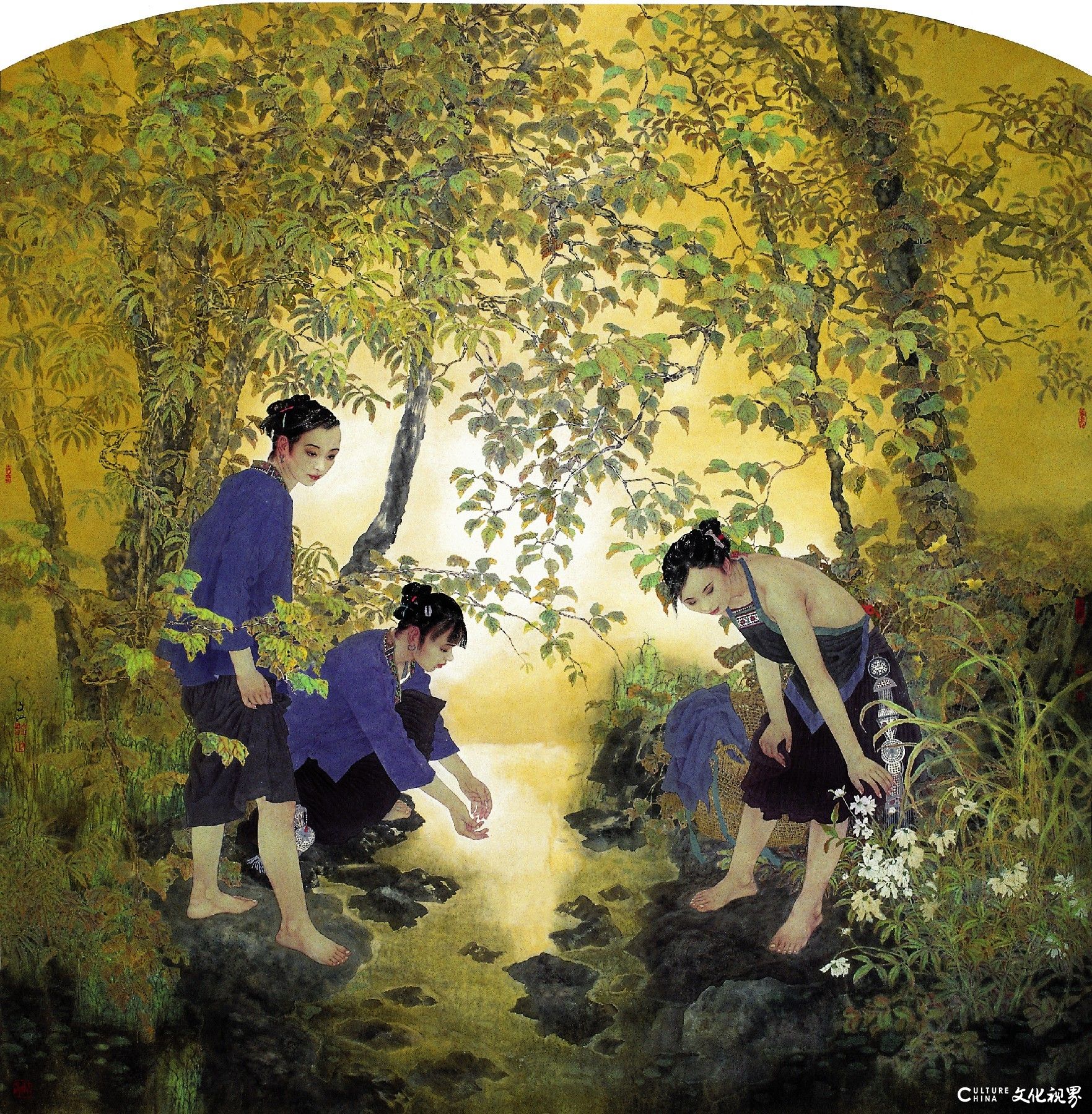 他对女性形象的刻画尤为值得关注,其笔下的女性既延续了唐宋仕女画的典雅气质,又注入了现代女性的独立精神。这种在古典美与现代性之间的游弋,使他的人物画超越了简单的形式创新,成为对人性深度的视觉解码。他对传统材料的探索同样具有启示意义,他尝试将生宣纸的渗透性与工笔重彩相结合,使画面在保持水墨氤氲的同时,又能实现多层次的色彩叠加。这种对材料特性的极致挖掘,使笔墨不再是依附于造型的工具,而成为具有独立审美价值的生命体。