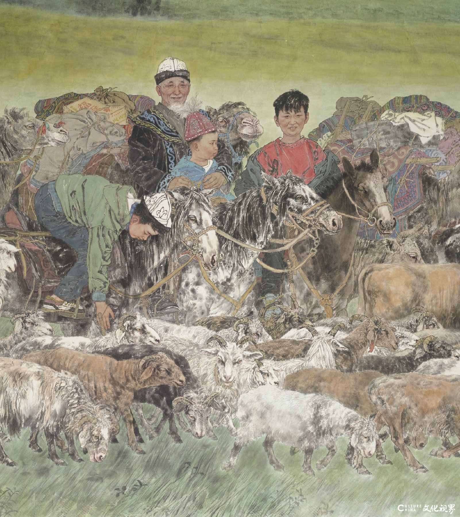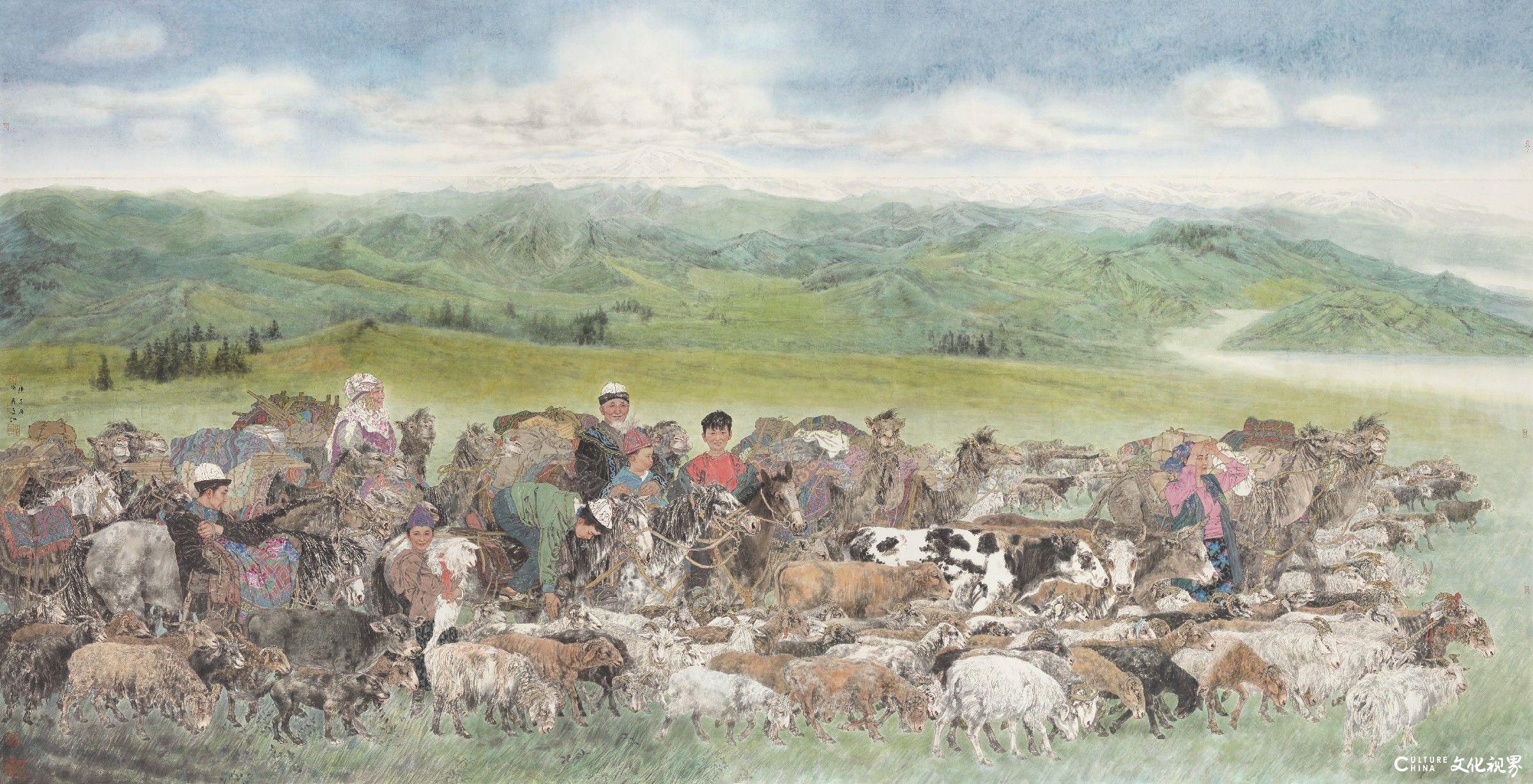 《哈萨克迁徙——春的牧场》纸本水墨设色2020年190cm×367cm一带一路国际美术工程入选作品