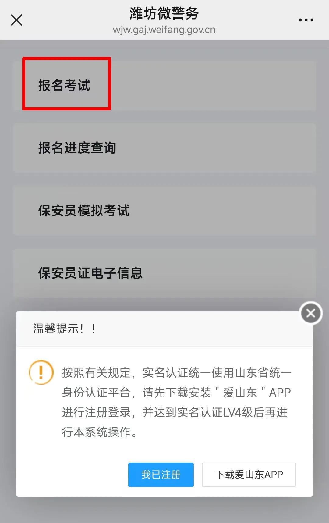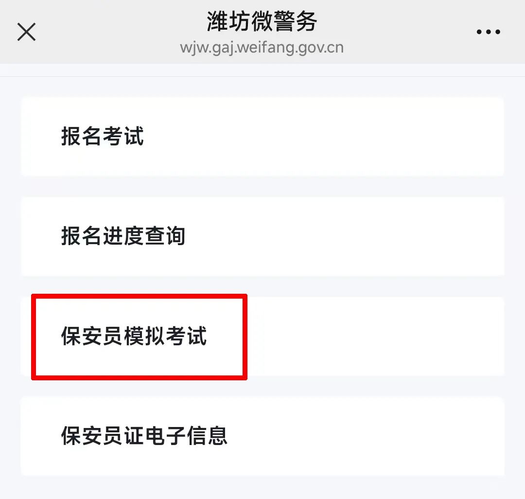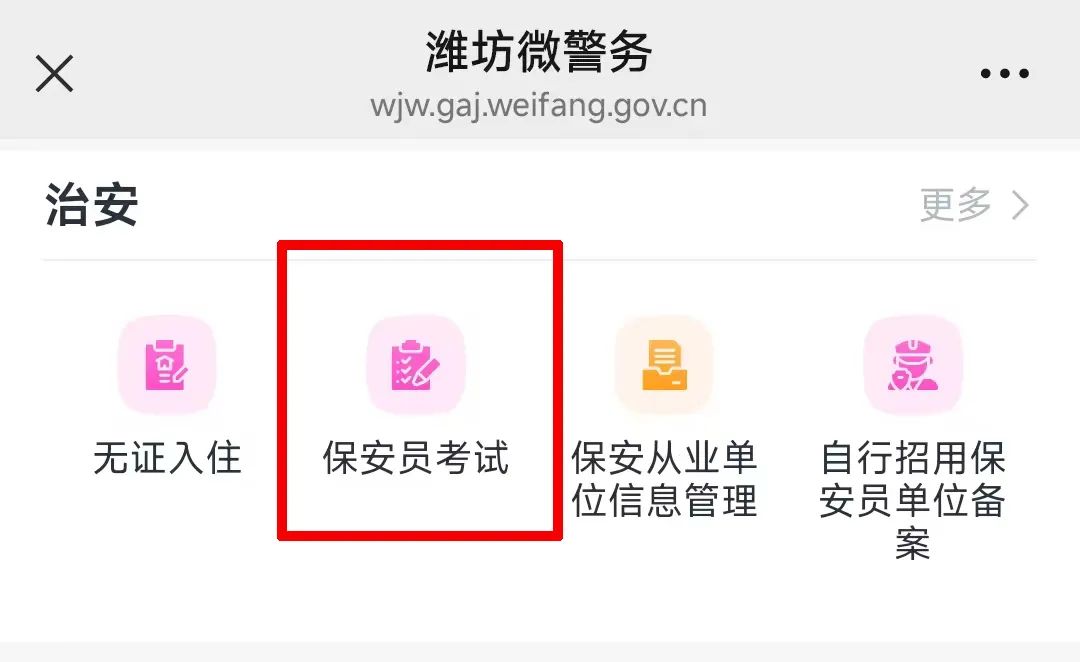 点击【治安】版块的【保安员考试】,根据提示注册登录后,向潍坊微警务提交相关报名资料,微警务推送至所在县市区公安局进行审核。