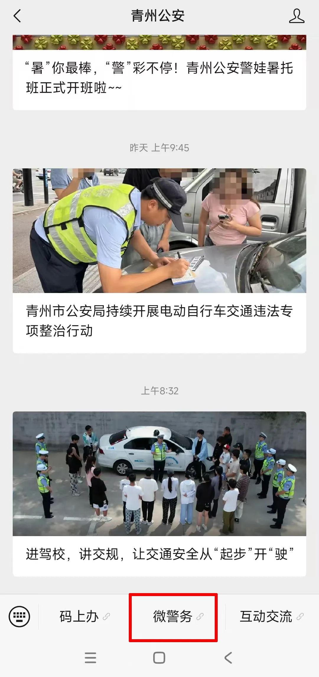 申领保安员证办理流程凡自愿参加保安工作并符合保安员证资格考试条件的人员,可关注“青州公安”微信公众号,点击下方进入【微警务】。