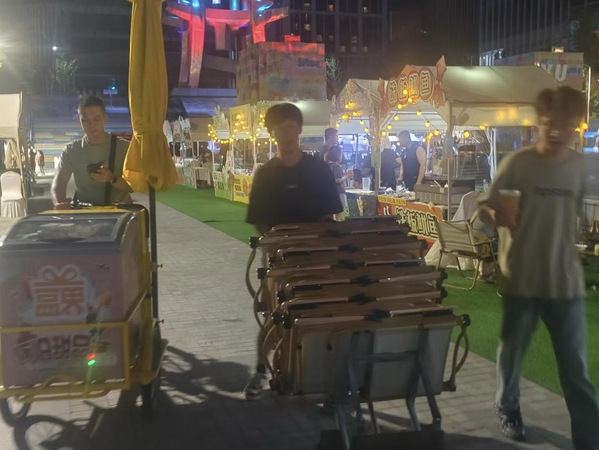 夜幕降临时,夜市小组的身影混进烟火里。他们搬桌椅、摆商品,在人流中穿梭着介绍商品、收款找零。收摊时,每人收获120元。