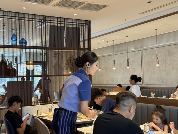 另一组队员曹雨滋润等在餐厅,以服务员身份开启挑战。他们穿梭于餐桌间,快速响应顾客需求,及时清理餐盘、补充餐具、解答疑问。从起初的手忙脚乱,到逐渐掌握服务节奏,精准把握顾客用餐过程中的细节需求,在与顾客、同事的协作中,学会沟通与应变,深刻理解服务行业“以客为先”的理念,以及团队配合保障运营的关键。