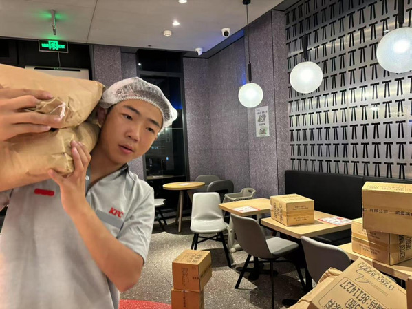 在肯德基门店,队员李宜飞身着工服、头戴卫生帽,承担货物搬运与整理任务。面对堆积的物资,他有序规划搬运路径,凭借体力与耐心,高效完成货物上架、分类归置,在重复劳作里,锻炼出责任心与执行力,也体会到餐饮后勤保障的不易。