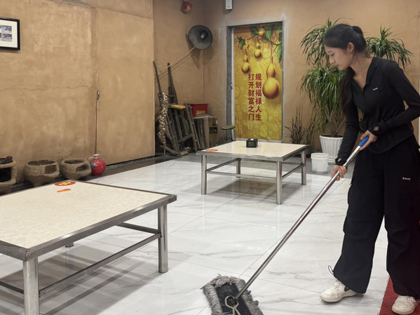 饭店小组的拿着拖把,从角落开始,一点点推进。看似简单的拖地,实则要顺着纹路反复擦拭,遇到角落的油渍,得用抹布蹲身蹭擦。除了地面,他们还要轻擦古朴桌椅的雕花缝隙,整理散落的杂物。当日收入150元。