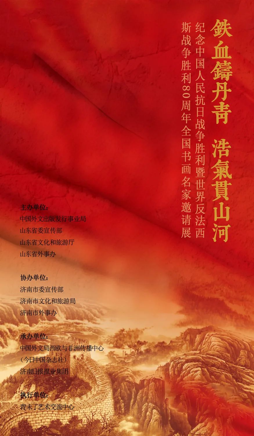 八十载岁月峥嵘,山河焕新;八十载薪火相传,浩气长存。2025年是中国人民抗日战争胜利暨世界反法西斯战争胜利80周年。这场伟大胜利,是中华民族从苦难走向复兴的历史转折,是世界正义力量捍卫和平的光辉篇章。为铭记历史、缅怀先烈,弘扬伟大抗战精神,传承中华优秀传统文化,并献礼9月3日抗战胜利大阅兵,特别举办此次大展。丹青写壮志,翰墨抒豪情,本次展览汇聚全国书画名家的精品力作,以艺术之名致敬历史、礼赞和平。这些作品既是历史的艺术凝练,也是时代的深情回响,更彰显了当代艺术家的使命担当与文化自信。愿观众通过这些作品,感受历史的厚重与艺术的感染力,从中汲取奋进力量,在新时代的征程上砥砺前行,共同谱写民族复兴的壮丽篇章。铁血丹心,山河为证;浩气长存,艺术永彰。谨以此展,向所有为民族独立、人民解放而牺牲的英雄致敬,向永不褪色的伟大抗战精神致敬!