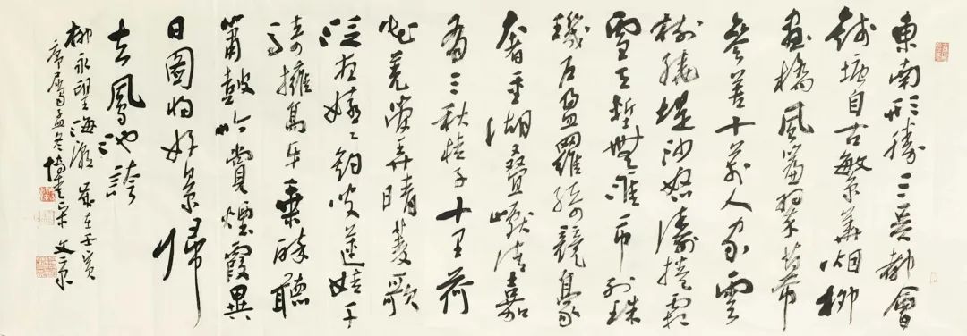 文化积淀已化为生命体验,让他的创作能“不落俗套”,自然流露。广泛地阅读赋予其作品独特的“书卷气”,与他笔下孜孜以求的“金石气”交融共生,表现为碑帖融合,南北兼容,形成了其艺术独特的内在风骨。