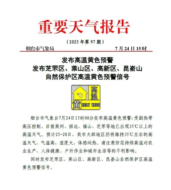 受副热带高压控制,目前莱州、招远、福山、芝罘等地已出现35℃以上的高温天气。预计25-28日,我市大部地区仍将维持35℃左右的高温天气,气温高,湿度大,体感闷热。请注意防范持续高温对农业生产、人体健康、户外作业和城市生活等的不利影响。同时发布芝罘区、莱山区、高新区、昆嵛山自然保护区高温黄色预警信号。