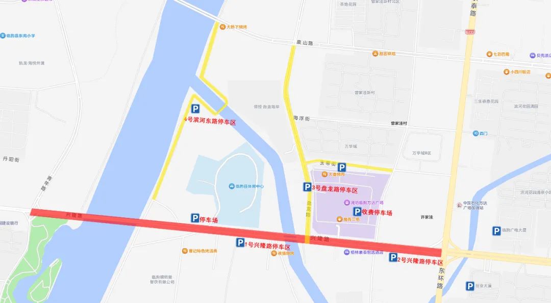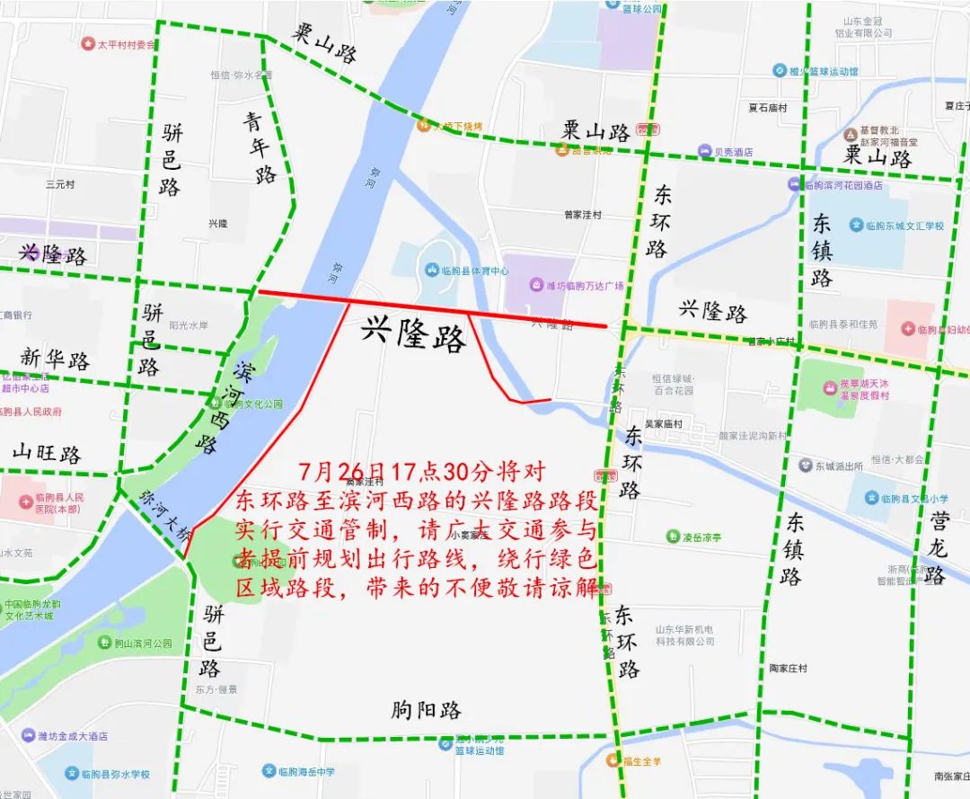 1.兴隆路路段(东环路以西至滨河西路以东)2.滨河东路路段(粟山大桥以南至弥河大桥以北)3.兴隆路盘龙路路口以北只允许车辆北行交通管制绕行示意图