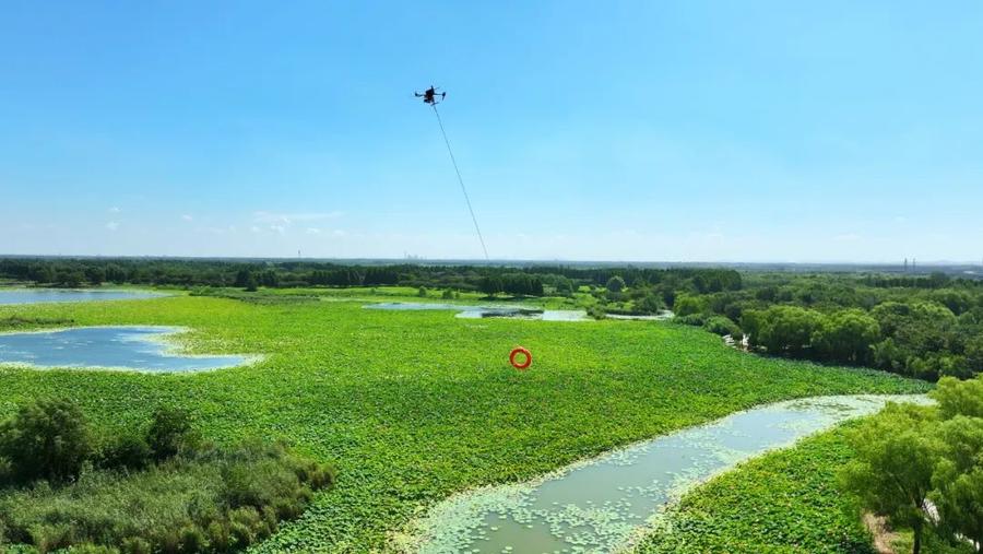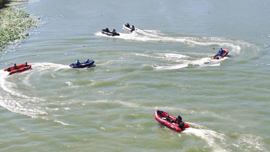 “发现落水人员,请立即救援!”在开阔水域模拟人员溺水场景,随着指令下达,救援人员迅速进入实战状态,相继展示打桩式、跨步式、平跳式、蛙式入水方式,并运用抛绳包救援、岸边活饵式救援、水上遥控机器人救援、无人机抛投救生圈等多种岸边救援技术,以及无动力艇翻船自救、离心力救援等舟艇救援技术,迅速将“落水者”安全救起,动作一气呵成,尽显专业素养。