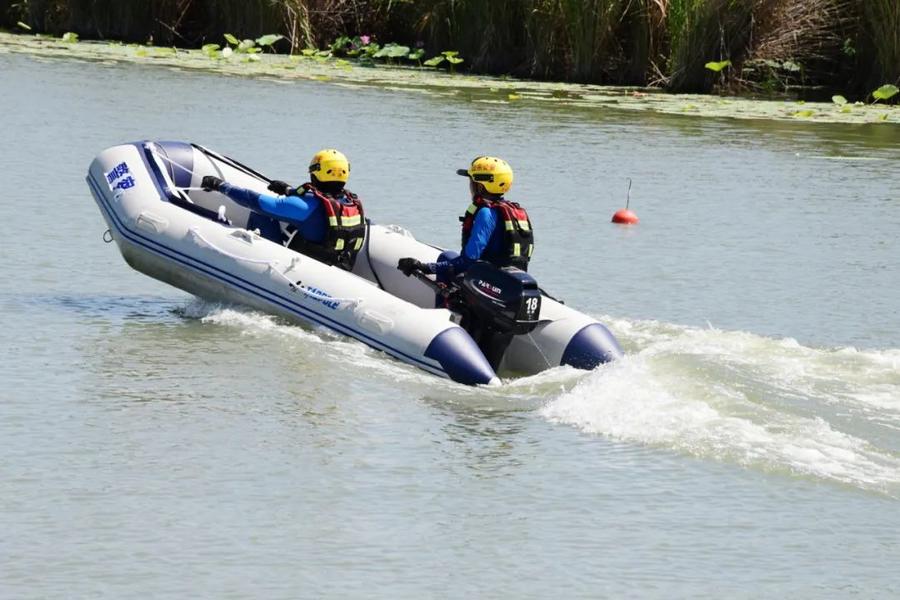 在舟艇驾驶技术展示区,救援人员展示了三角队形编组航行、S型避障、O型绕圈航行、翘头行驶等舟艇驾驶技术。面对模拟的漂浮物、狭窄水道等复杂情况,队员们凭借精湛的操控技术和丰富的经验,确保舟艇在各种极端条件下都能稳定、高效、安全地执行任务。