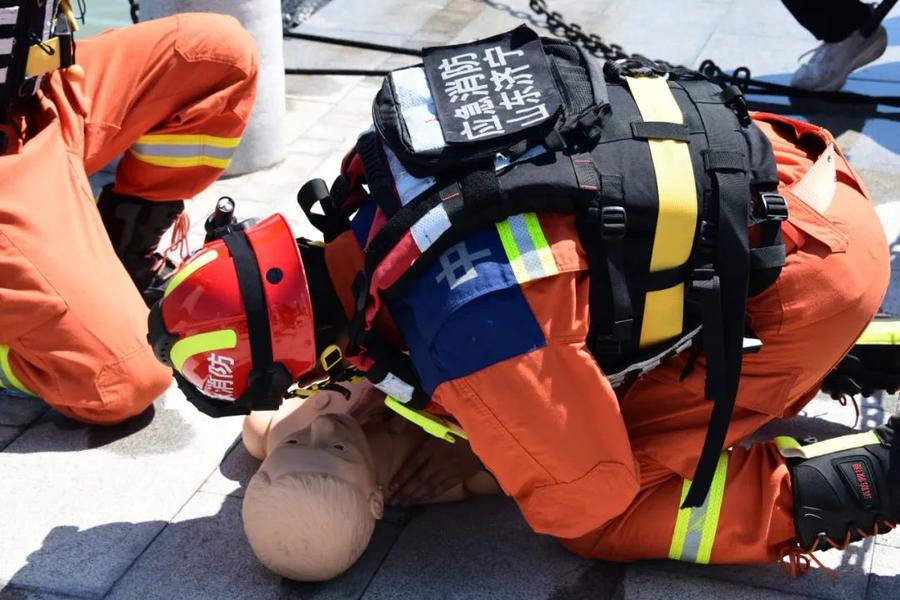“快!再快一点,每一秒都关乎生命!”“溺水者”被成功救起后仍处于无意识、无呼吸或呼吸微弱状态,此时,救援人员箭步上前,立即展开溺水急救。轻拍重唤、开放气道、心肺复苏(CPR)、胸外按压、人工呼吸……队员们操作规范、配合默契,与时间赛跑,模拟还原了从水中到岸上生命救治的黄金救援链,为生命争取每一秒希望。