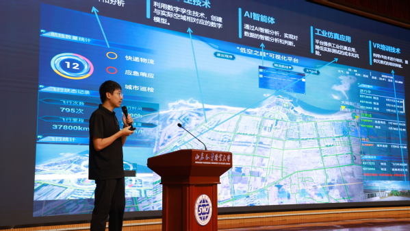 学校元宇宙研究院院长于卓展示了“低空之眼”系统,体现了学校在技术研发与实践应用中的创新成果。学校低空经济产业负责人邢振鹏介绍了学校低空经济专业规划与产业布局。