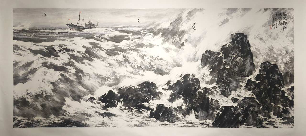 刘君玉先生的水墨画,动静相生,刚柔相济。他画海,借鉴“致广大、尽精微”的美学传统,大成水墨交响,奏出时代强音,彰显海洋文化的深广,体现祖国江山之壮丽、人民之豪迈,表征着新时代的国力之强和盛世气象。