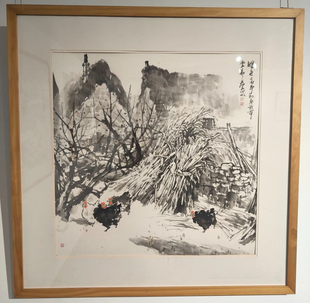 欣赏刘君玉先生创作的《暖冬》:取童年记忆的农家院落一角入画,视角独特,运笔自如,水墨酣畅,把光秃秃的小树、富有质感的柴草垛、徜徉悠闲的家鸡、矮短的石头墙以及稍远的海草房连缀成一个有机的意境整体。看似繁杂,实则有序,空灵素雅,澄明静谧。此图虽然不大,但它寄至味于淡泊,有粹美而不雕,就像一首田园诗,引人遐思。