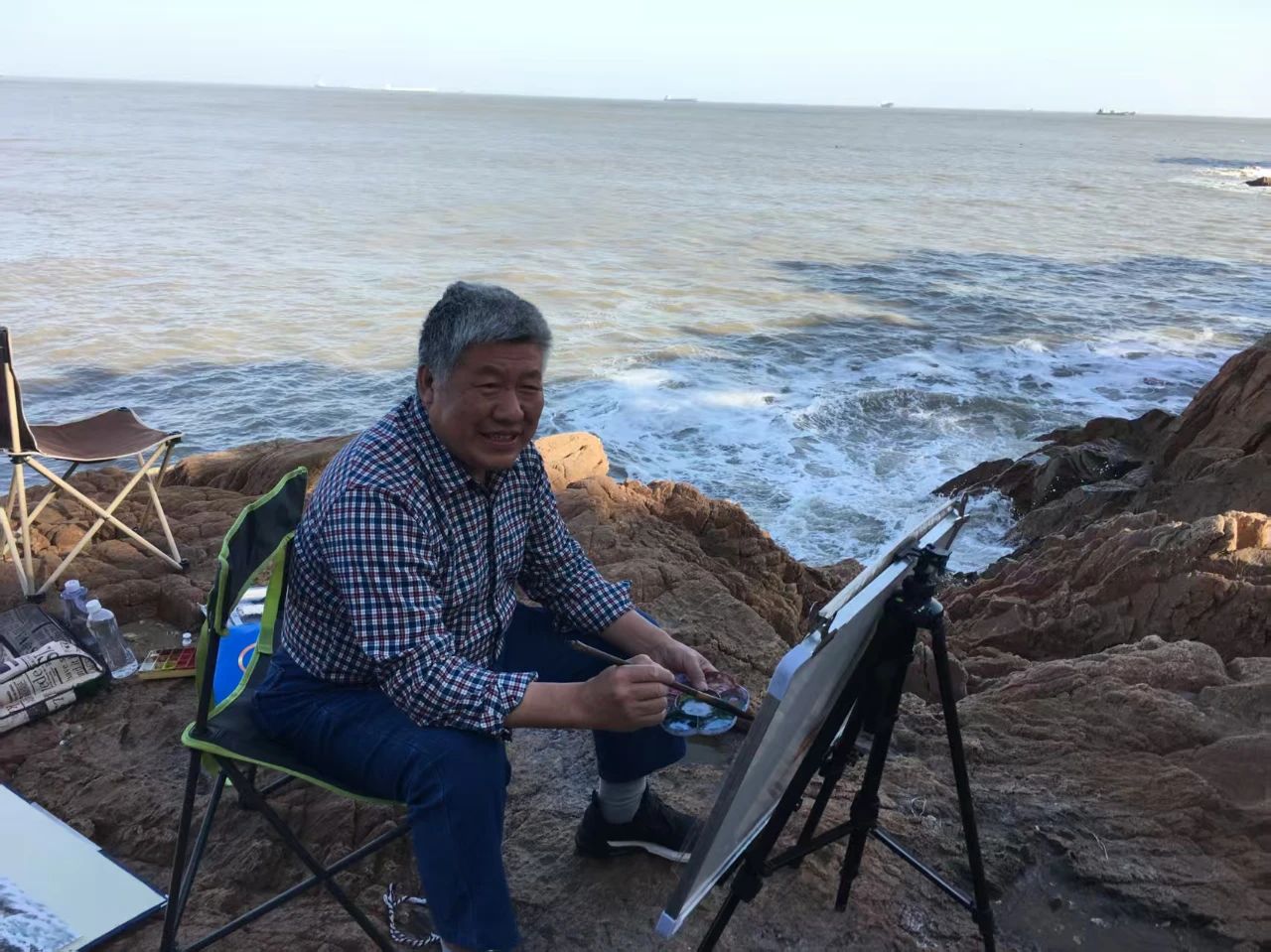 在本次画展开幕仪式的致辞中,刘君玉先生深情地说:“我的绘画人生从孩童时起,始终怀有坚定的文化理想,始终坚持深入生活、感怀时代。过去的三十年,在夫人的陪同下我写生遍及荣成的渔村、渔港码头,画出心中的那片海,浓缩成我个人的绘画三部曲:大海、渔船、海草房。”