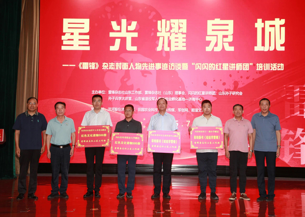 7月30日,星光耀泉城——《雷锋》杂志封面人物先进事迹访谈暨“闪闪的红星讲师团”培训活动在济南举行。活动期间,雷锋杂志社山东工作部向山东外事职业大学赠送500册红色文化读物。济南校区党委书记左琪代表学校参加活动。