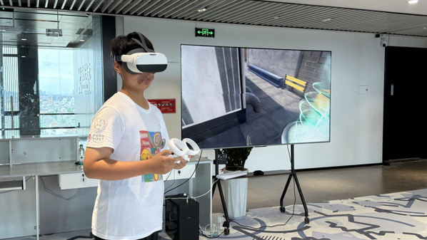 活动现场为孩子们设置了体验环节。在工程师团队的指导下,孩子们可以通过佩戴专用VR设备,亲身参与到沉浸式的虚拟世界交互中。通过万向仪和VR眼镜,灵活控制游戏中的人物做出各种动作,在虚拟世界中尽情探索、互动。孩子们在轻松愉快的氛围中直观感受到了科技的神奇魅力,也在潜移默化中激发了对科学技术的兴趣和探索欲望。