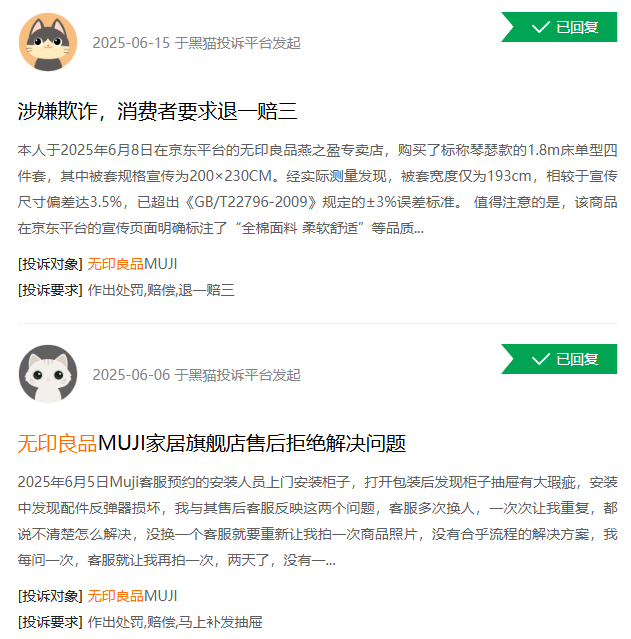 在黑猫投诉平台上以“无印良品”为关键词进行搜索,能够看到2200多条投诉,大多集中在欺诈消费者和售后服务差等问题。