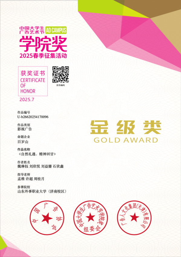 日前,中国大学生广告艺术节学院奖2025春季大奖赛颁奖典礼在北京盛大启幕。山东外事职业大学传媒学院师生凭借出色创意脱颖而出——由孟维、许超、周桂月三位教师指导,魏琳钰、刘欣悦、刘益姗、石欣鑫同学共同创作的参赛作品《自然礼遇,精神回甘》,一举斩获影视广告类金奖,为学校赢得殊荣。