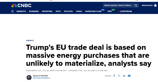 美国主流媒体之一的CNBC,就发表了一篇文章《分析人士说,特朗普的欧盟贸易协议是基于大规模的能源采购,这不太可能实现》。