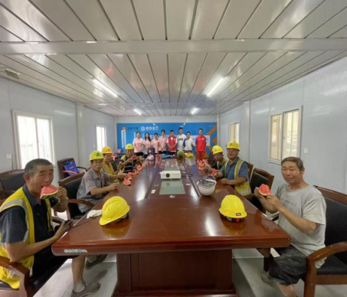 针对夏季高温,服务队联合社区为附近工地的30余名建设者送去西瓜、绿豆汤等解暑物资,志愿者们还帮忙搬运施工材料、整理临时宿舍,用点滴行动传递组织温暖。校社双方通过资源共享、优势互融,构建起“双向奔赴、美美与共”的联动新格局,让志愿服务深度赋能基层治理。