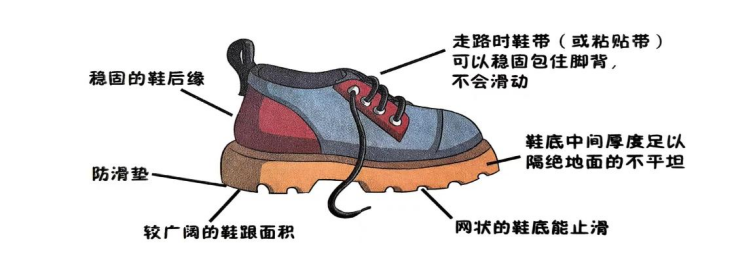 穿合适的鞋对于老年人而言,在保持躯体的稳定性中有十分重要的作用,能够减少跌倒的发生。因此,老年人在挑选鞋子时应仔细观察和比较鞋子各部分特点和功能,选择安全合适的鞋。