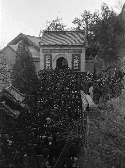 向阳山举办《收租院》展览的事我在《济水之南》中写过,但相关影像之前没有见到过。近日雍坚先生向我提供了几张王建浩先生1966年拍摄的《收租院》展览图片,从中可以清楚地看到,当年兴国禅寺山门上布置的标语,“不忘阶级苦,牢记血泪仇”十个大字代替了旧有的那副著名的对联。这组珍贵的照片中,不仅有展室入口和室内镜头,还有“济南向阳山泥塑《收租院》展览开幕大会”的纪实影像,而这个开幕大会,应是在山下平缓的场地间举行的,看得出,观众们群情激奋,在台上主持人带领下,举着“红宝书”,喊着口号,这是当年司空见惯的场景。