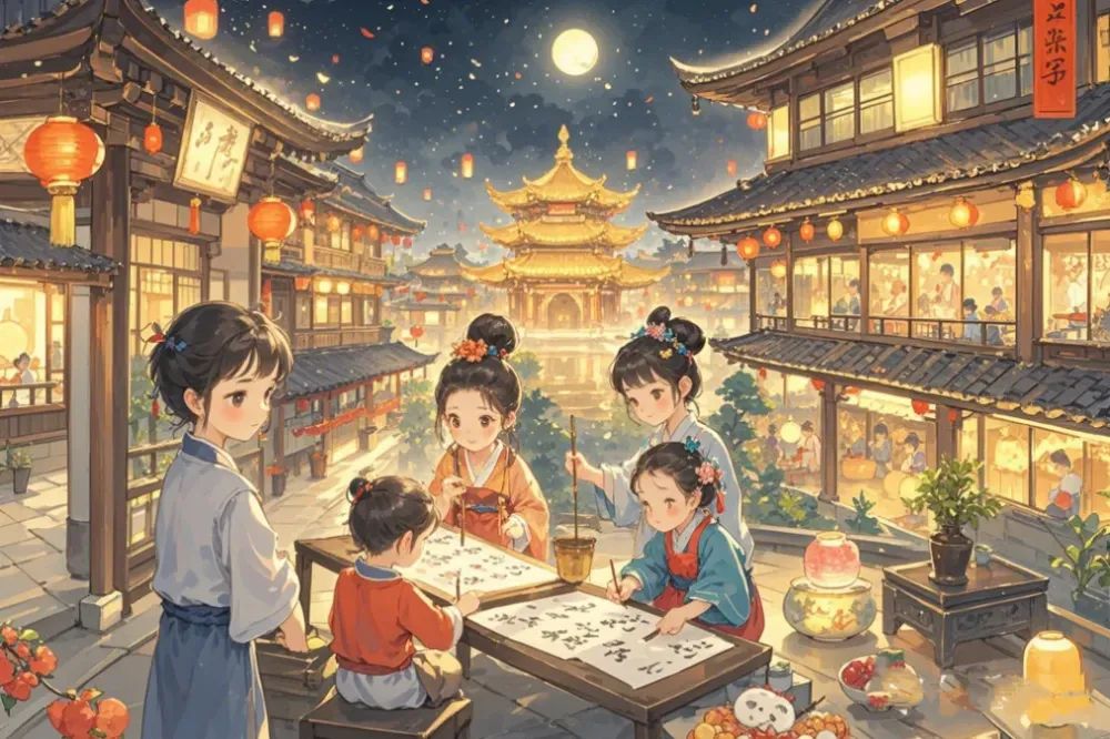 《初学记》四引《荆楚岁时记》:“七夕妇女结彩楼,穿七孔针,或以金银鍮石为针,陈瓜果于庭中以乞巧。有喜子网于瓜上,则以为得。”七夕非但女性高兴,也是孩子们欢乐的节日,即“儿童辈特地新妆,竞夸鲜丽”。