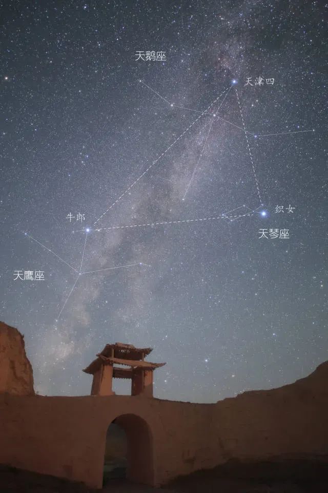 中国古代星宿之中,牛宿,由六颗星组成,位于银河东岸,呈两个倒置三角形。上面的三角形,更大更亮;下面的小三角形,组成一头牛,头上有两角,有三只足,人称牵牛。牵牛南边,有九颗小星,组成天田,是耕作之地;再向南,接近南方地平线,是九星,称为九坎,坎是蓄水之地;东面,三星,称为罗堰;牛宿北部,三星,称为织女——织女一星,是全天第五亮星,仅次于大角星,人称织女星。牛宿星、织女星,合称牛郎织女星。
