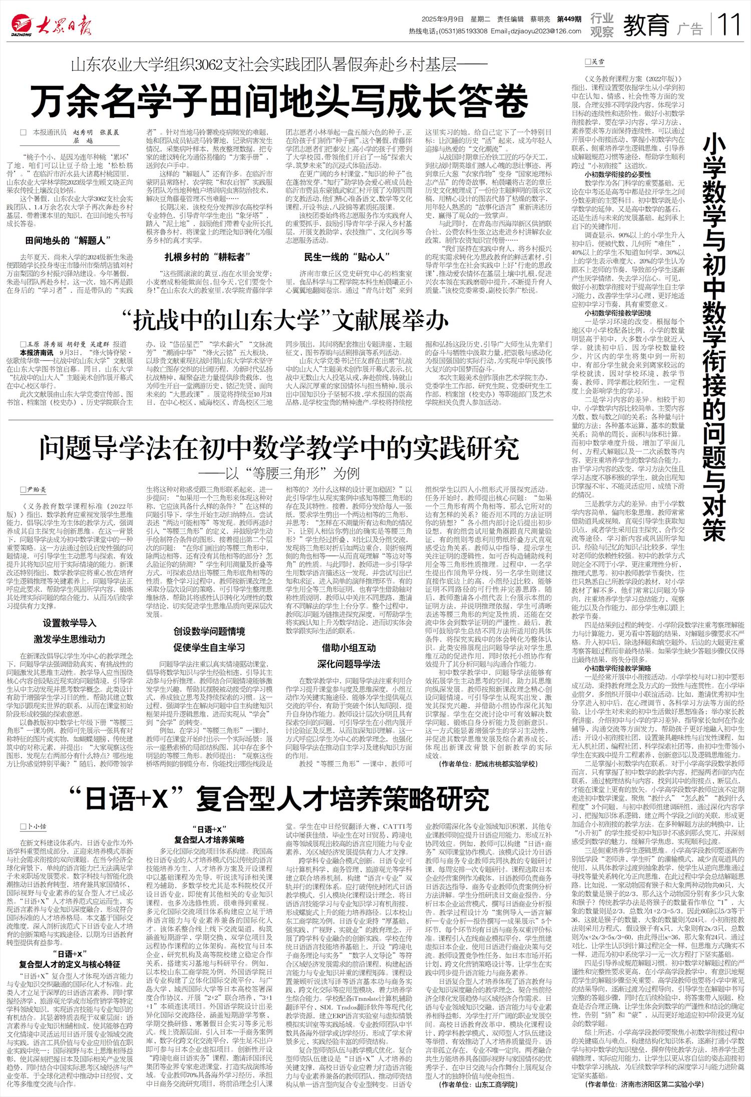 山东大学党委书记任友群在出席“抗战中的山大人”主题美术创作展开幕式表示,抗战中无数山大人投笔从戎、奔赴前线,铸就山大人深沉厚重的家国情怀与担当精神,展示出中国知识分子坚韧不拔、学术报国的崇高品格,是学校宝贵的精神遗产。学校将持续挖掘和弘扬这段历史,引导广大师生从先辈们的奋斗与牺牲中汲取力量,把崇敬与感动化为报国强国的实际行动,为实现中华民族伟大复兴的中国梦而奋斗。