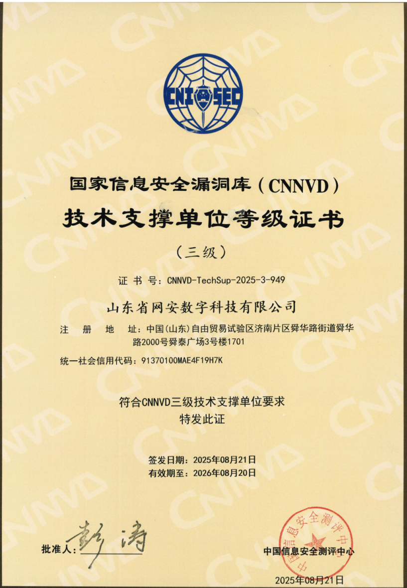 近日,山东科创旗下网安数科成功通过国家信息安全漏洞库(CNNVD)的严格审核,正式荣获“CNNVD技术支撑单位”资质,成为国家网络安全保障体系中的重要一员。