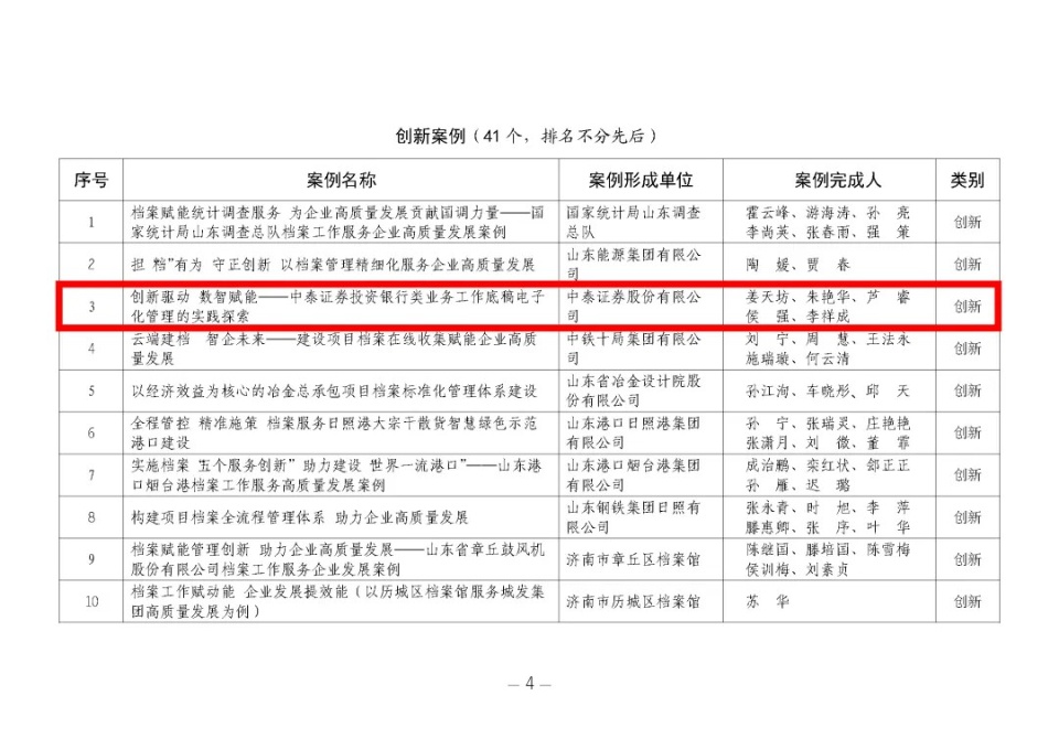 中泰证券投行业务底稿电子化管理实践获评山东省“档案服务企业高质量发展·创新案例”