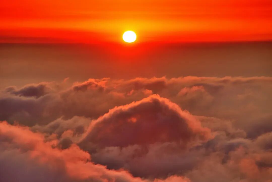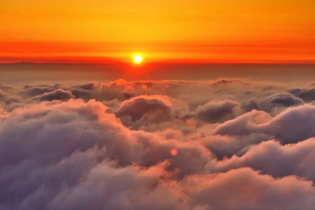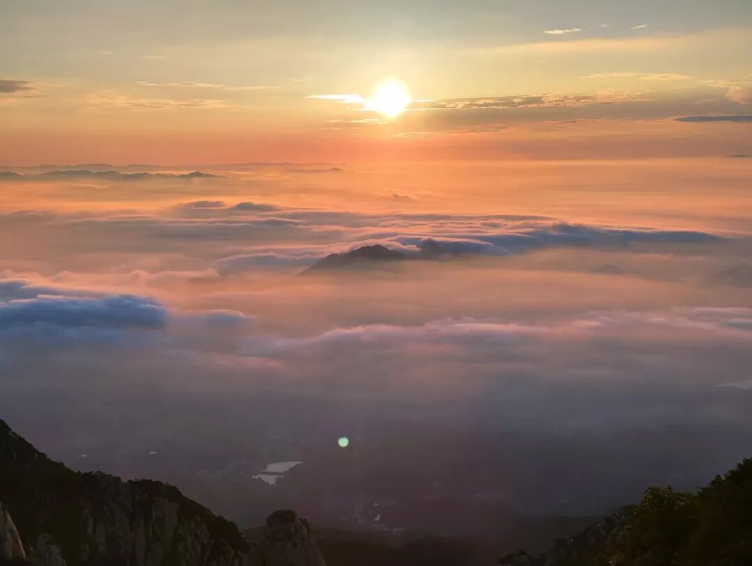 天色渐明,东方微露鱼肚白。云海由墨灰转为淡青,继而染上微红。人群屏息,凝视远方。忽然,云际跃出一点金红,渐渐扩大,成为弧光,终于一轮红日喷薄而出。
