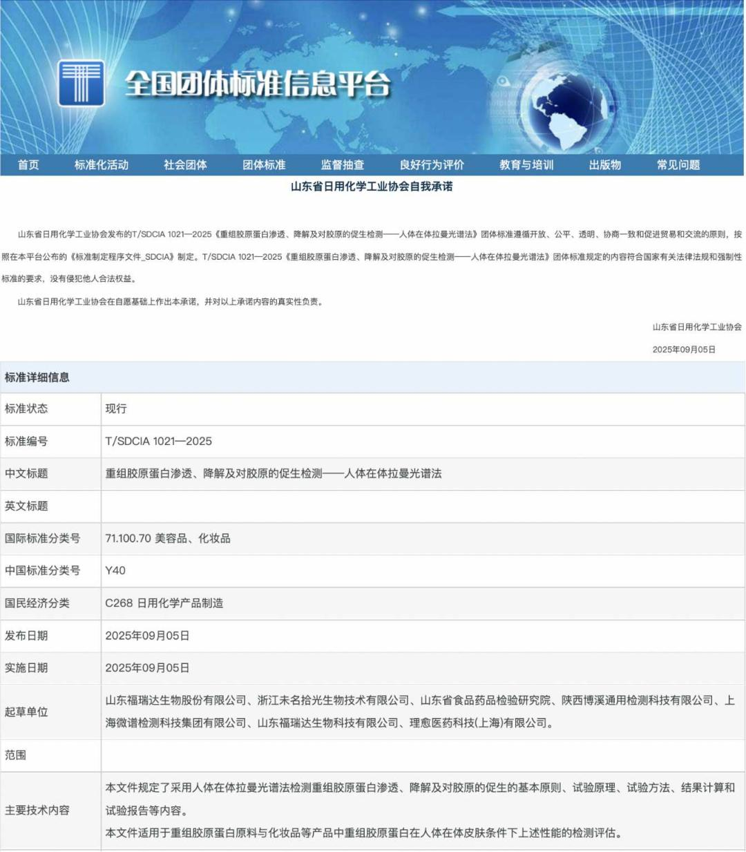 近日,由山东省日化行业协会归口组织、山东福瑞达生物股份有限公司牵头起草的《重组胶原蛋白渗透、降解及对胶原的促生检测——人体在体拉曼光谱法》团体标准正式发布实施,标志着重组胶原蛋白皮肤渗透检测有了新标准。