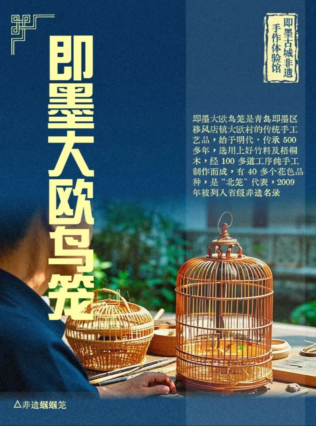 📍到非遗工坊,体验即墨老酒封坛、大欧鸟笼制作等非遗技艺。若恰逢周末,还可在鸭绿池戏台附近欣赏即墨大鼓书、柳腔等非遗展演。