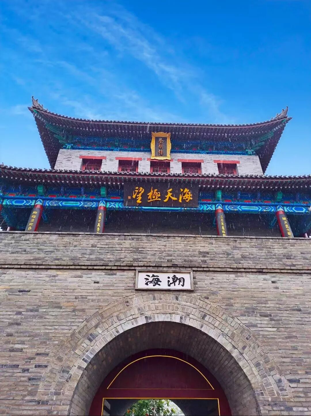 如果天气晴朗,可前往古城东门的潮海门,登上奎明楼,欣赏古城与周边的风景。奎明楼悬有董其昌所题的“海天极望”匾额,文化底蕴深厚。可以在奎明楼内盖章,之后在古城里的汉服租赁店,租一套汉服,以古城为背景,拍摄照片。