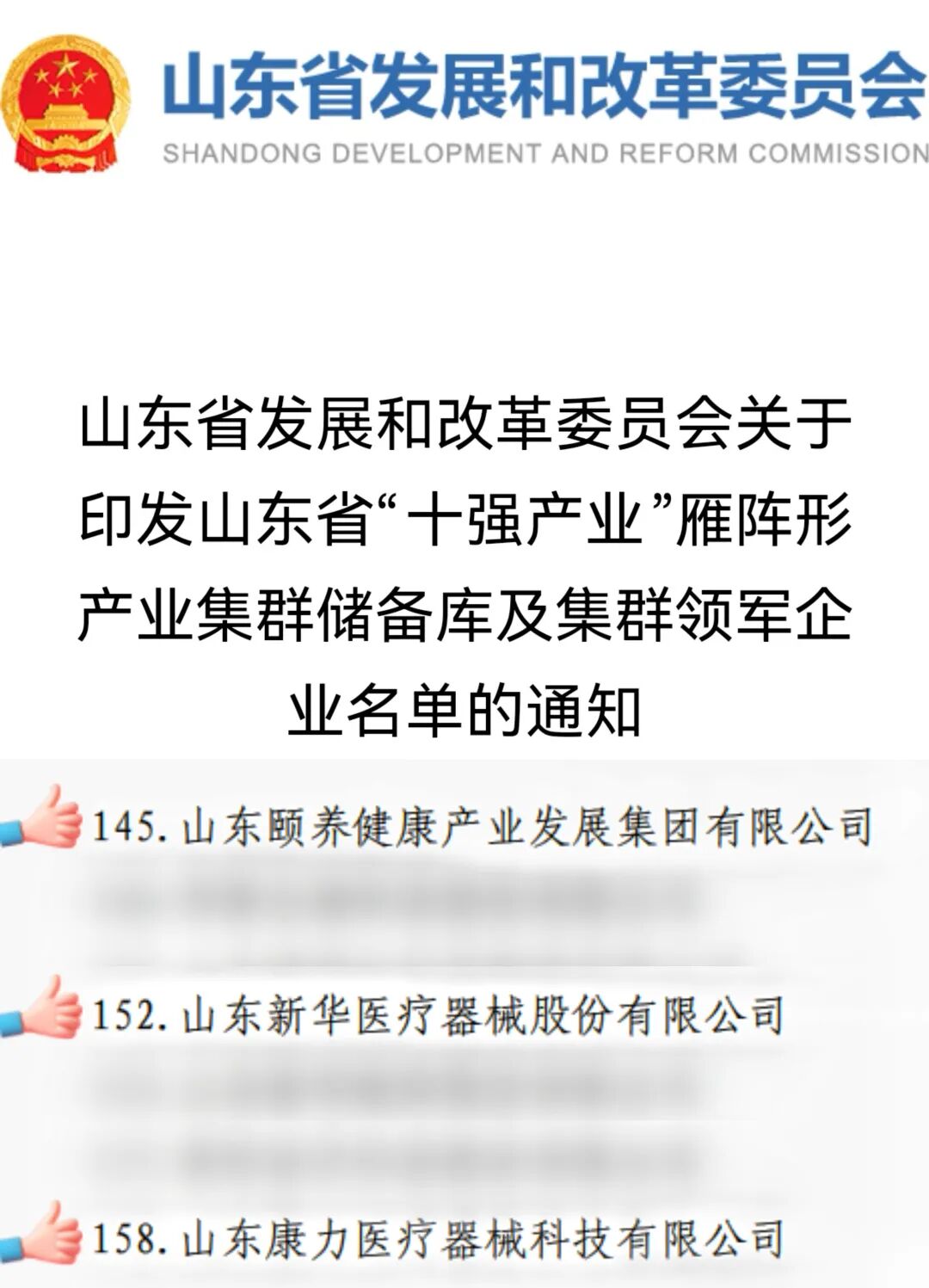 近日,山东省发展和改革委员会印发了“十强产业”雁阵形产业集群储备库及集群领军企业名单,集团及权属单位新华医疗、康力医疗成功入选医养健康产业集群领军企业名单。