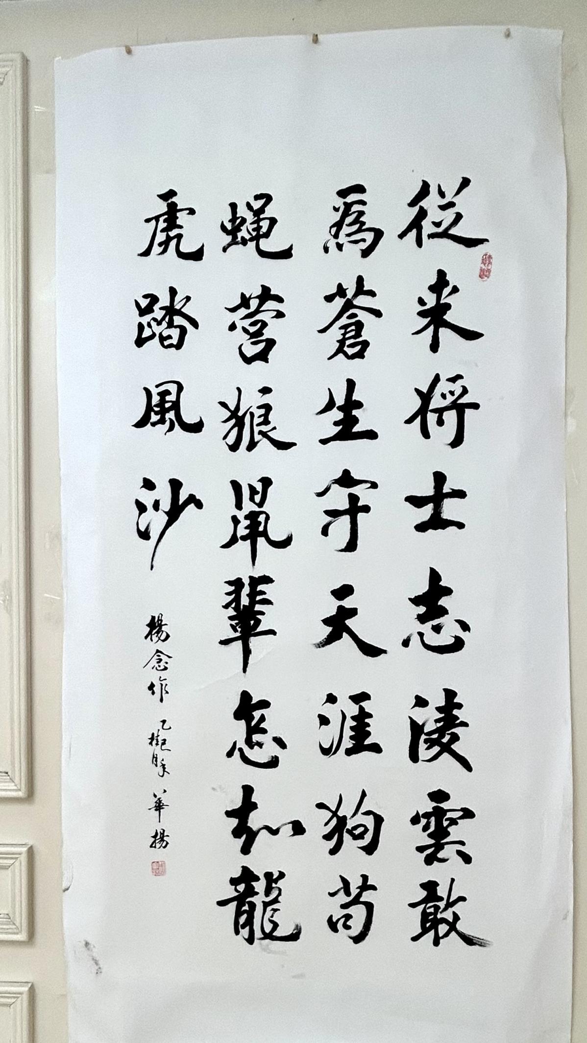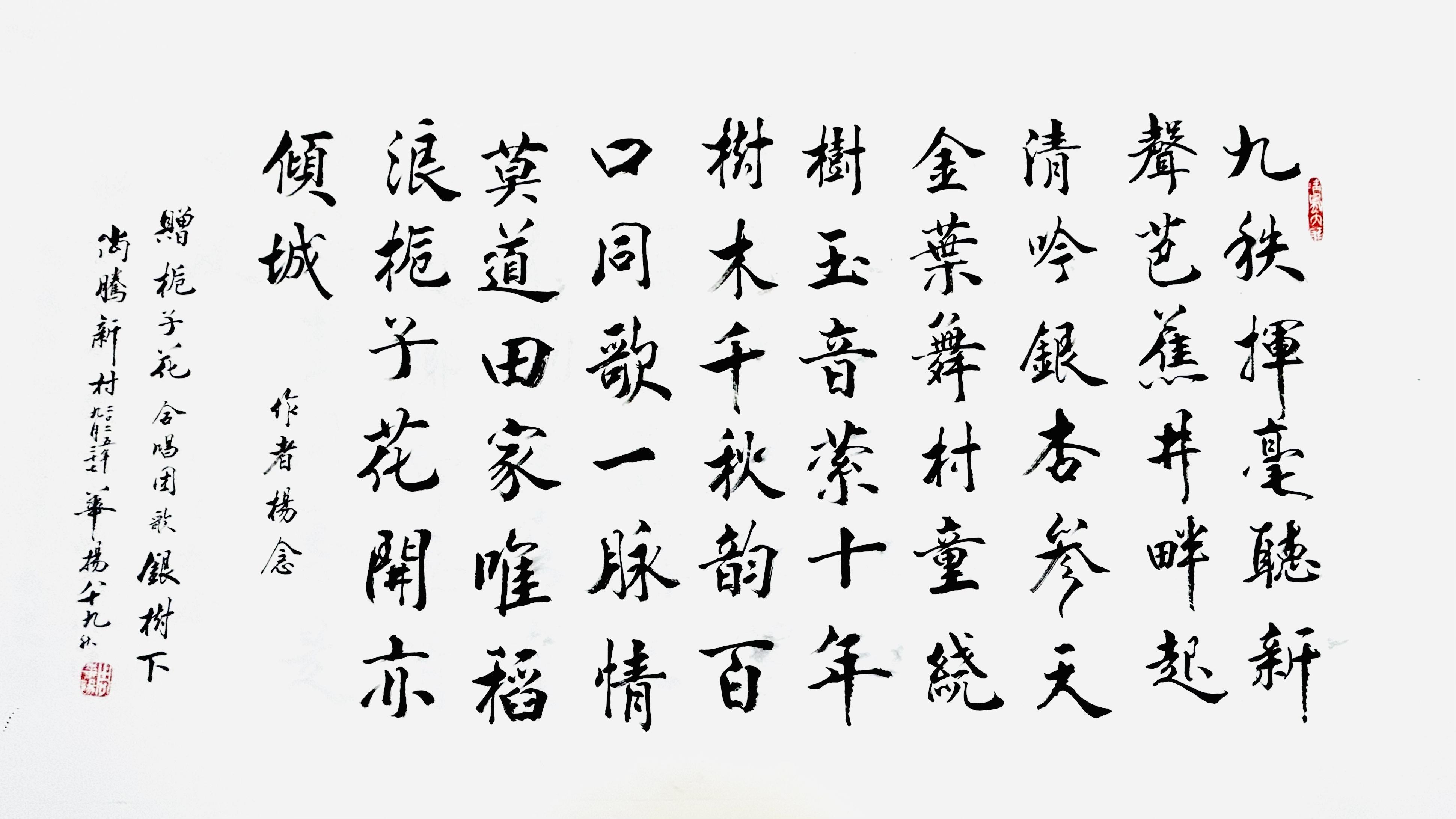 九旬老人周华扬的书法作品笔力沉雄,气韵流动,将乡土文化与现代审美融为一体,既传统又新颖,为书法创作打开了新的视野。是“新时代农民精神气质的鲜活写照”,既凝聚了乡土大地的质朴气息,也展现出乡村振兴中文化赋能的动人力量。他的作品扎根泥土,散发芬芳,既有大地的厚重,又有时代的清新。乡村振兴,既美在面貌,更贵在灵魂——他的墨迹,正是乡土灵魂的生动诠释。