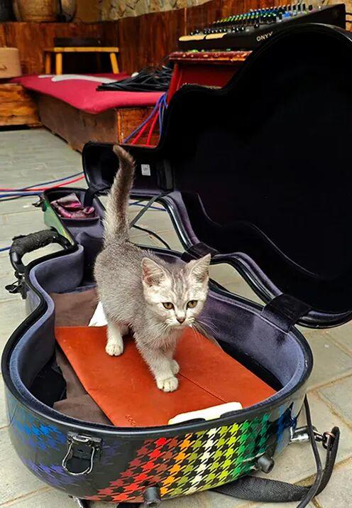 中秋节前一天的“【弓·弦】大提琴与古典吉他”演出我去看了,也见到了那三只小可爱。尤其灰色的“小门”,来到这个剧场之家虽晚,见到观众时却一点儿不怯场,不仅在观众坐席下的缝隙间来回穿行,闲庭信步,竟然还跳进装吉他的琴盒里。看到美女给它示意,它便很懂事的样子,乖乖地依偎其身旁,任其抚慰,讨人欢喜。