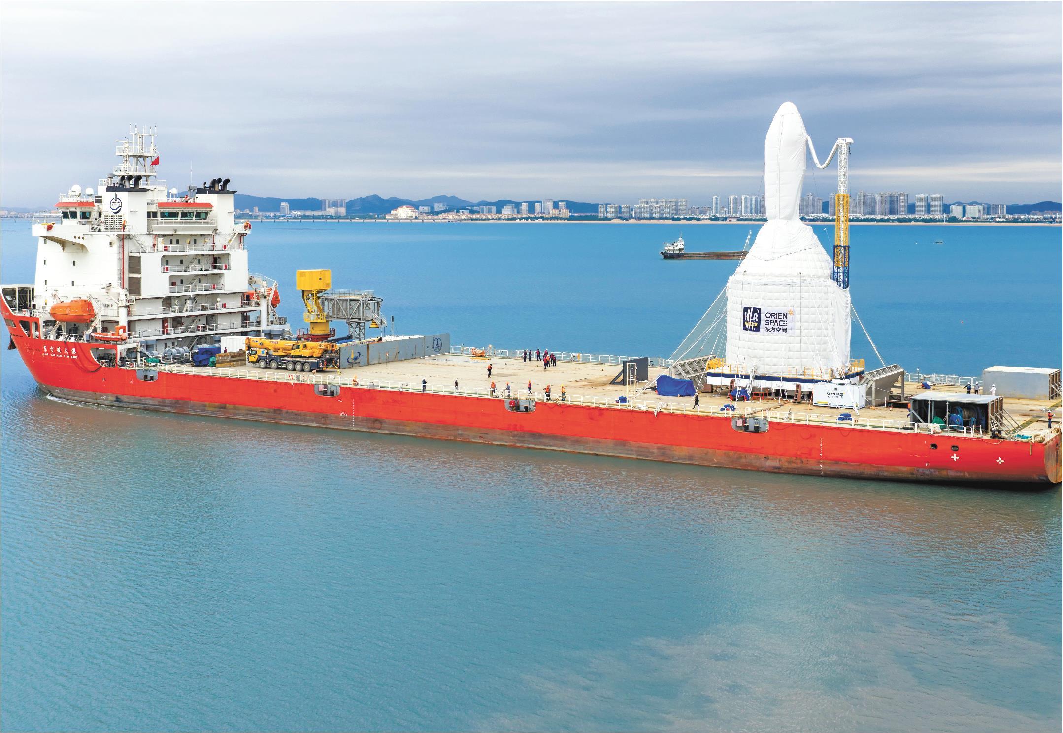 10月9日,引力一号(遥二)运载火箭搭乘“东方航天港”号发射船转运至山东海阳附近海域。