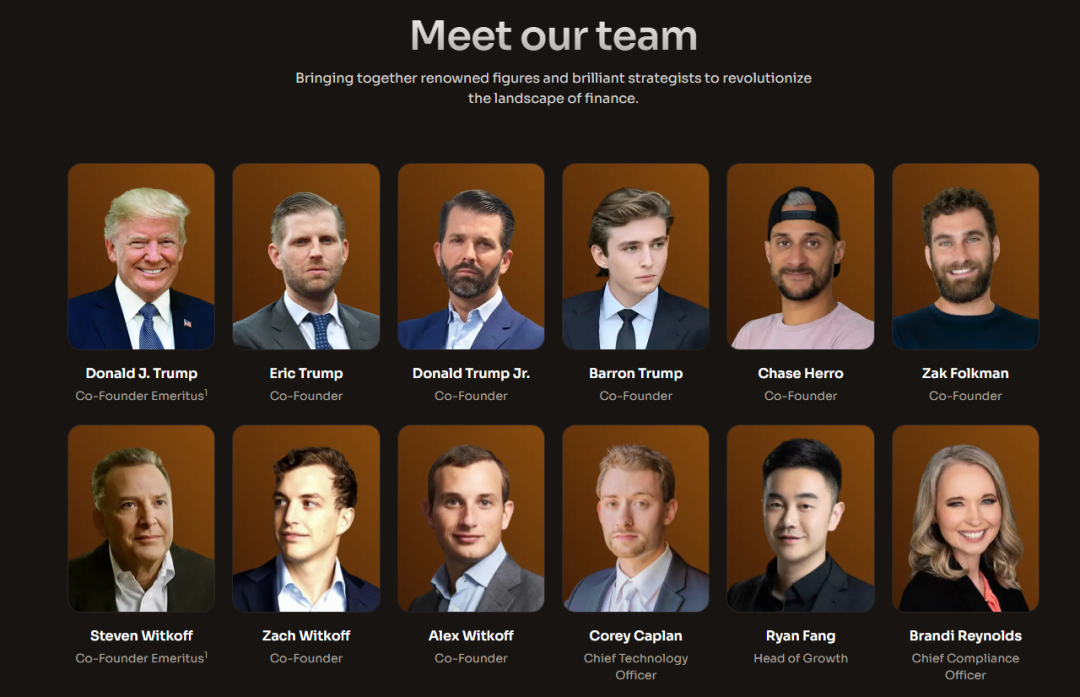 翻开“世界自由金融”的官网,公司团队赫然出现特朗普和他的三个儿子,另外一个家族也备受瞩目,威特科夫和他的两个儿子。