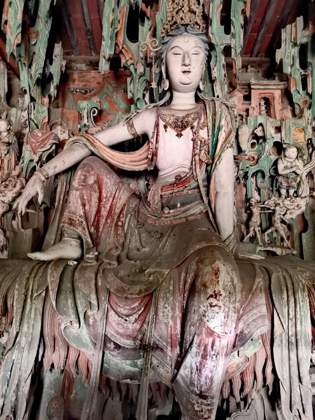 您看:“工匠在泥塑表面施以‘沥粉贴金’工艺,使菩萨的璎珞宝冠历经千年仍金光流转。更令人惊叹的是菩萨面部的‘开脸’技艺——用极细的笔触勾勒出若有若无的笑意,从不同角度观看会产生微妙的表情变化,这种‘多维表情’的处理手法在世界雕塑史上都属罕见。”我特别喜欢这尊自在观音。