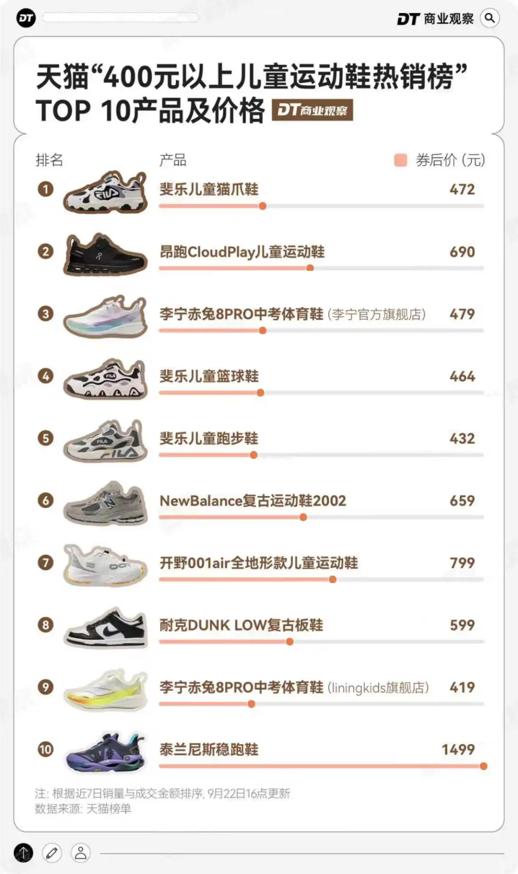 天猫“400元以上儿童运动鞋热销榜”TOP 10产品及价格 来源:DT商业观察
