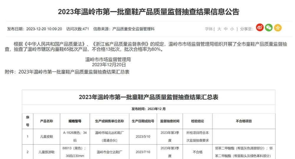 2023年温岭市第一批童鞋产品质量监督抽查结果信息公告
