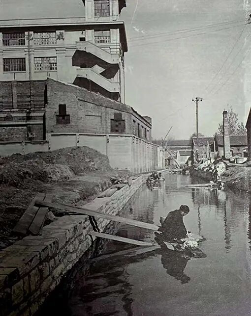 成记面粉厂位于俗称“小河”的生产渠畔,照片左侧多层建筑为该厂制粉楼,楼顶外墙还留有“成记”字样。