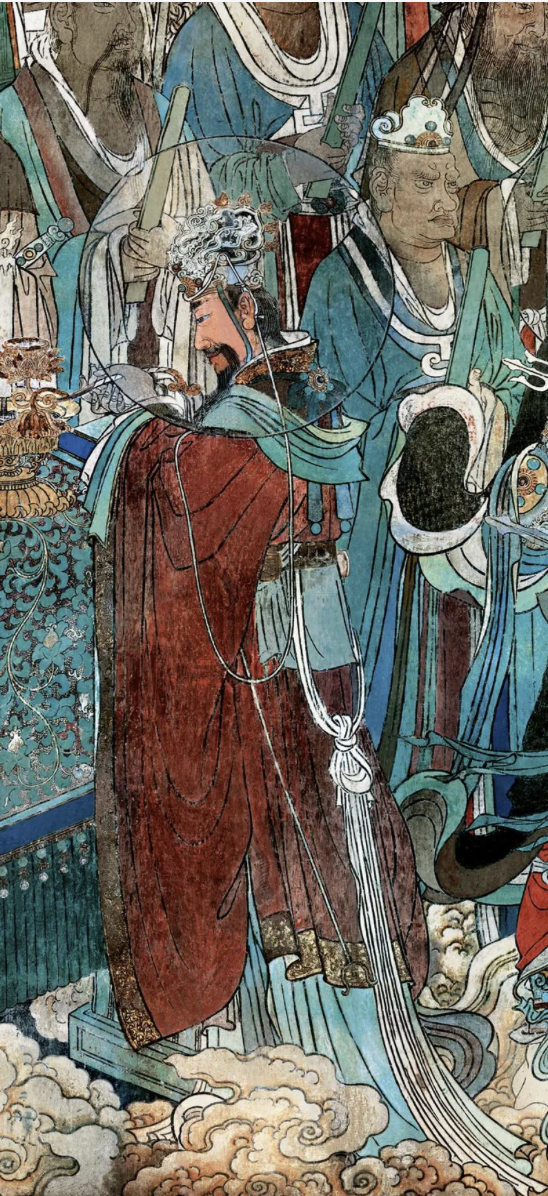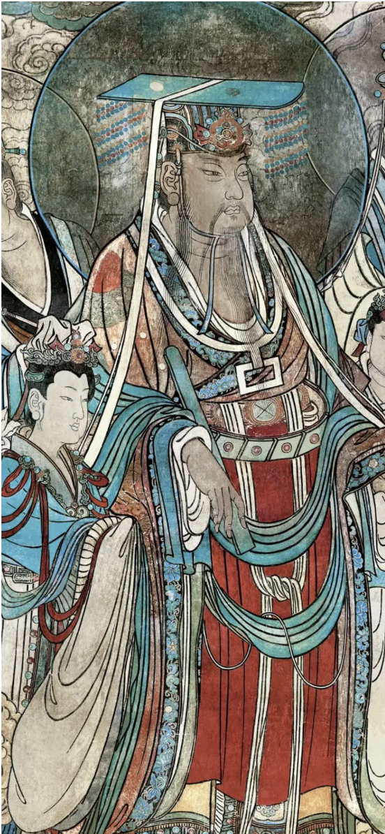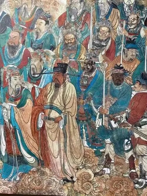 站在壁画前,舒建新低声说道:“你先看,这构图:最令人惊叹的是其严密的对称布局。画面以元始天尊为中心,众神分列两侧,层次分明,秩序井然。