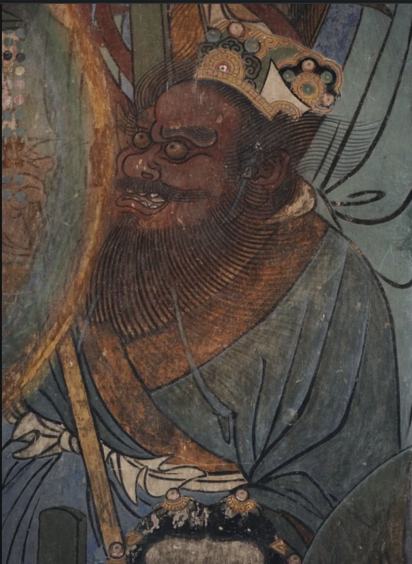 它的色彩之雅,历经七百年不褪。壁画以青绿为主调,辅以朱砂、金粉,既庄重又华贵。尤其令人称奇的是,许多细节处采用“堆金沥粉”工艺,使图案立体凸起,在光线映照下熠熠生辉。这种技法不仅增强了视觉冲击力,也体现了元代壁画工艺的巅峰水平。”