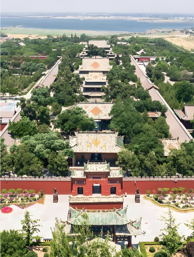 始建于隋朝的关公文化建筑群在晨光中展现出惊人的对称美。中轴线上的山门、午门、御书楼、崇宁殿、春秋楼依次排开,两侧配殿、廊庑如雁翅般展开,形成典型的"前朝后寝"格局。